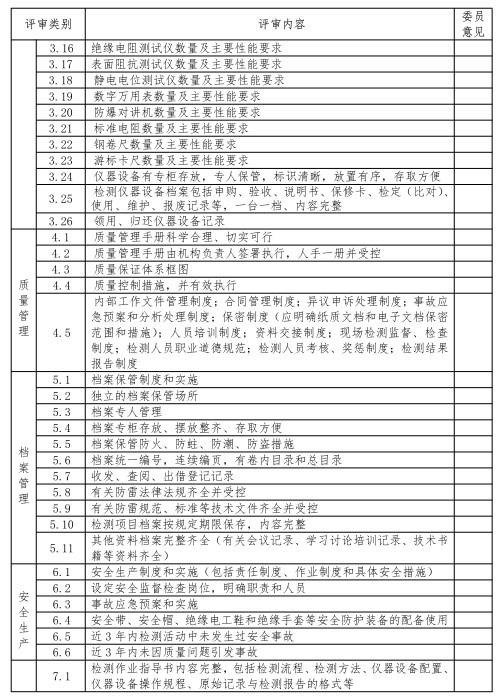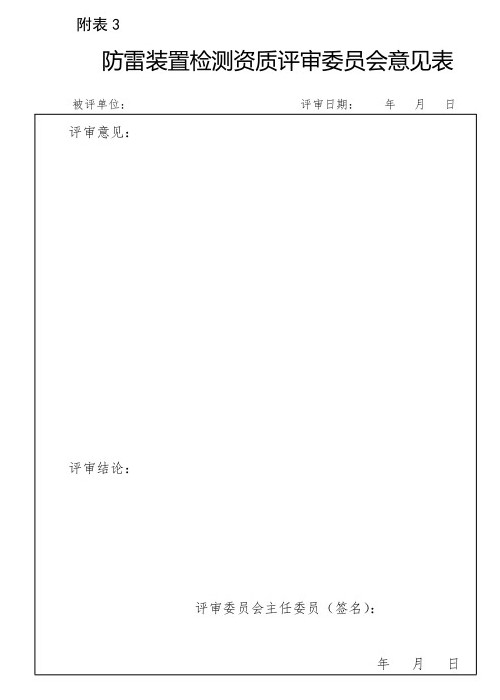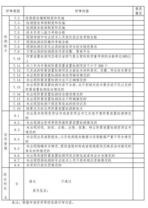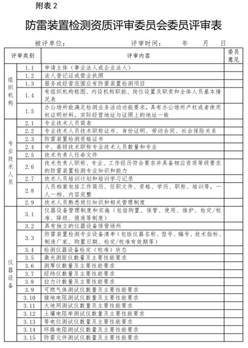 根據《雷電防護裝置檢測資質評審細則》第十二、十三條規定評審委員會按照《糖心LOGO官方网站在线观看免费檢測資質評審委員會委員評審表》(附表2)所列項目被評審單位現場考核情況匯報進行評定。