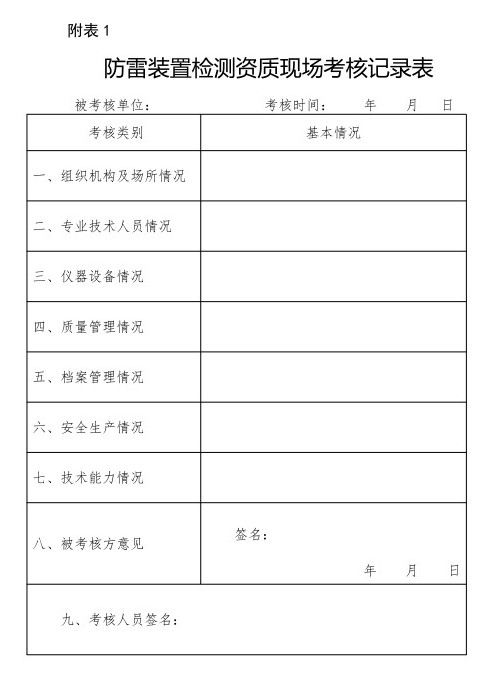根據《雷電防護裝置檢測資質評審細則》第九條規定,評審包括現場考核和會議評審。現場考核包括對技術負責人、專業技術人員進行理論考核,對指定檢測項目進行現場操作考核,對現場檢測記錄及出具報告的規範性等進行考核,並填寫現場考核記錄表,記錄表為細則中的(附表1)。